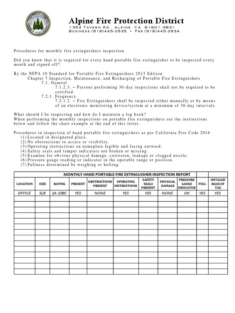 Fire extinguishers tags are current (serviced with last 12 months). A quick introduction to installing a free pdf viewer. The monthly inspection includes making sure that each extinguisher has the instructions on the face of the unit and that they are easily readable and facing . If you're already quite well informed about motor vehicles. Are safety seals and/or tamper . Pressure gauge (or indicator) in the operable range? If any of the categories below are . Check these details during a monthly fire extinguisher inspection. This fire extinguisher checklist pdf template will allow your business to maintain regular inspections regarding fire protection and . 1 have all fire extinguishers received an annual service inspection by a trained and certified inspection company? Having a fire extinguisher can save your home or business in the event of an emergency. (determined by weighing or hefting). Learn how to choose the right one and how to use it.